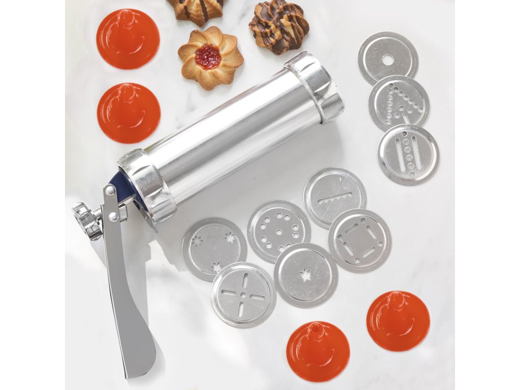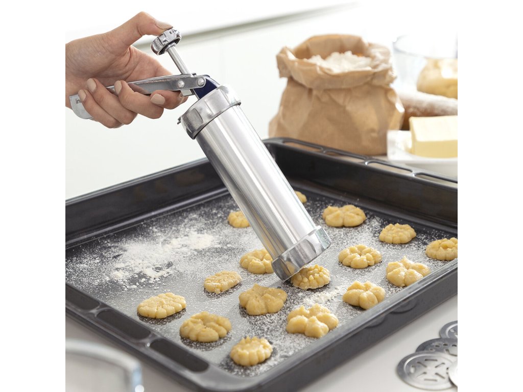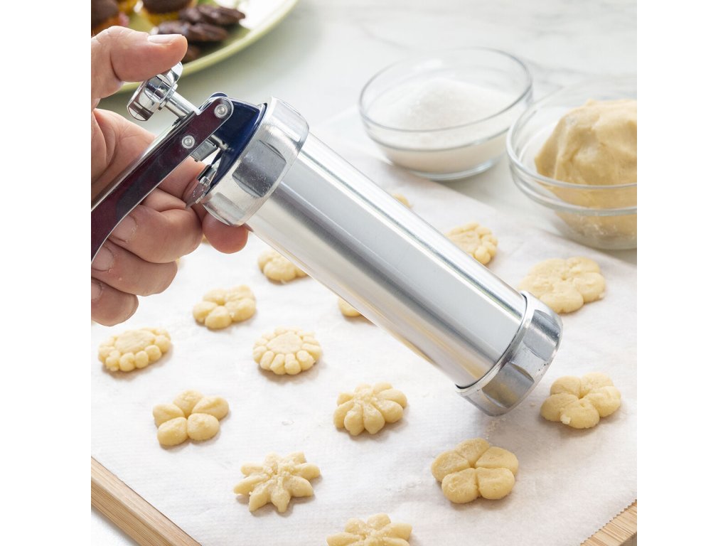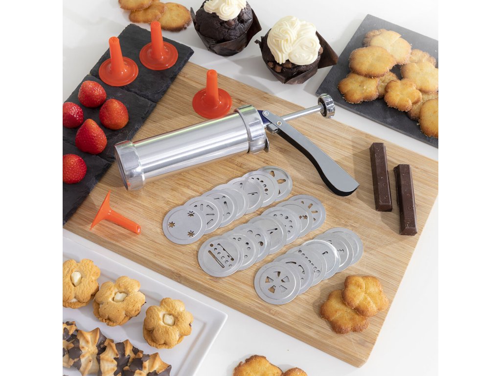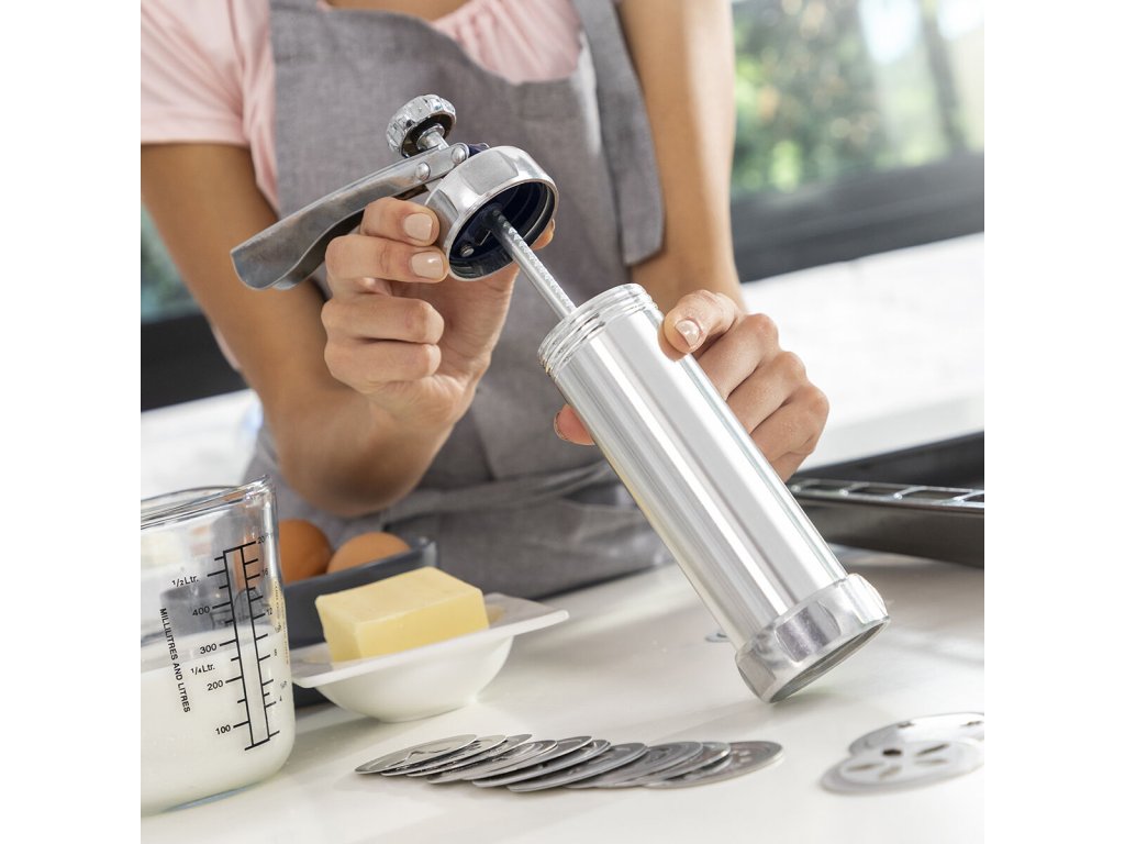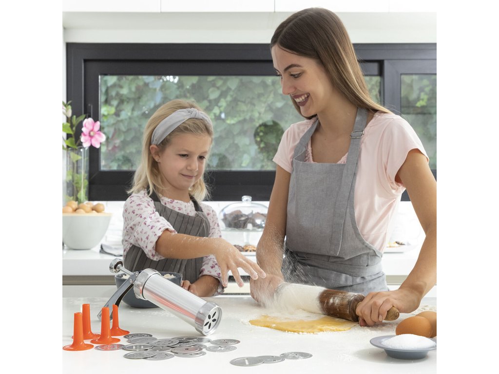 InnovaGoods je tu, aby vám pomohla variť ľahšie a zábavným spôsobom a preto vám ponúka novinky pre vašu kuchyňu, ako sú 2 v 1 prístroj na výrobu sušienok a zdobiace vrecko Prekies InnovaGoods ! Objavte širokú škálu vysoko kvalitných výrobkov, ktoré vynikajú svojou funkčnosťou, efektivitou a inovačným dizajnom!Výrobník sušienok, ktorý môžete použiť aj ako pištoľ, šetrí čas, námahu a priestor v kuchyni vďaka multifunkčnému dizajnu 2 v 1. Ide o veľmi ľahko použiteľnú ručnú nádobu na pečenie, ktorá vám a vašej rodine umožní pripraviť si chutné a originálne sušienky doma s použitím prírodných surovín. Je ideálny pre deti a dospelých, aby si užili zábavu pri rozvíjaní ich kreativity pri pečení a mali zážitok z prípravy a zdobenia vlastných sušienok ako rodina a zároveň prispeli k zdravšej strave. Táto viacúčelová pištoľ s ergonomickou rukoväťou má valcový tvar a je vhodná na sušienky, krémy, čokoládu atď. Má 20 šablón na výrobu sušienok v rôznych tvaroch a 4 špičky na rôzne ozdoby na sušienky, torty, torty atď. Môžete ju ľahko rozobrať a vyčistiť. Zahŕňa návod na použitie a základný recept na sušienkové cesto.