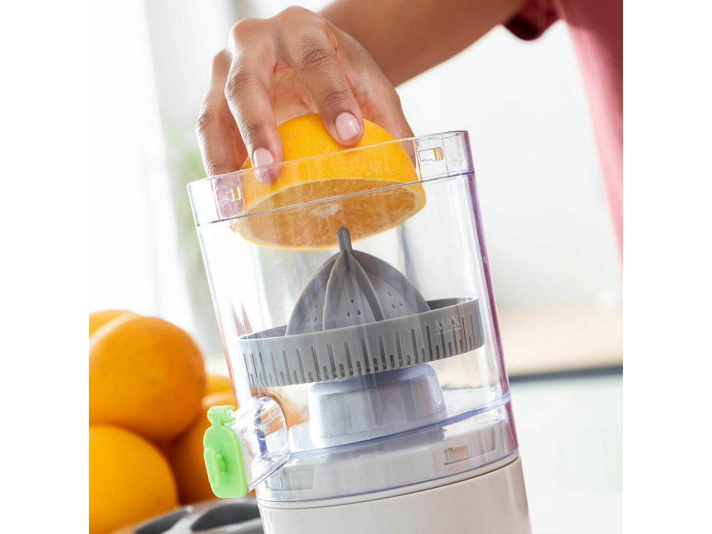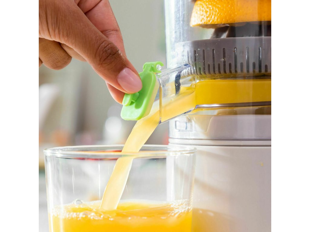 - Veko zabraňuje kvapkaniu, univerzálny: tento nábíjací odšťavovač je vybavený hermetickým uzáverom na výlevke šťavy, ktorý zabraňuje kvapkaniu a v prípade potreby uchováva štavu v odšťavovači. Vhodný na citrusy (pomaranč, citrón, limetka, grapefruit...) a iné mäkké ovocie (hrozno, melón a pod.). Objem: 250 ml.