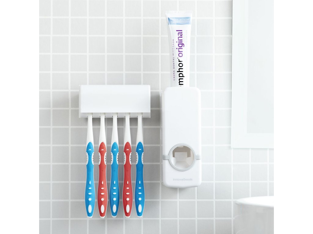 Dávkovač zubnej pasty s držiakom na kefky Diseeth od značky InnovaGoods je navrhnutý pre moderné kúpeľne, kde sa kladie dôraz na hygienu, poriadok a úsporu miesta. Jeho multifunkčný dizajn umožňuje nielen presné dávkovanie zubnej pasty, ale aj organizované uloženie až piatich zubných kefiek.