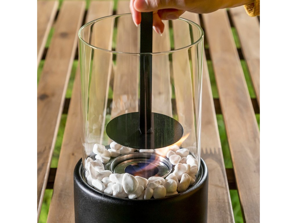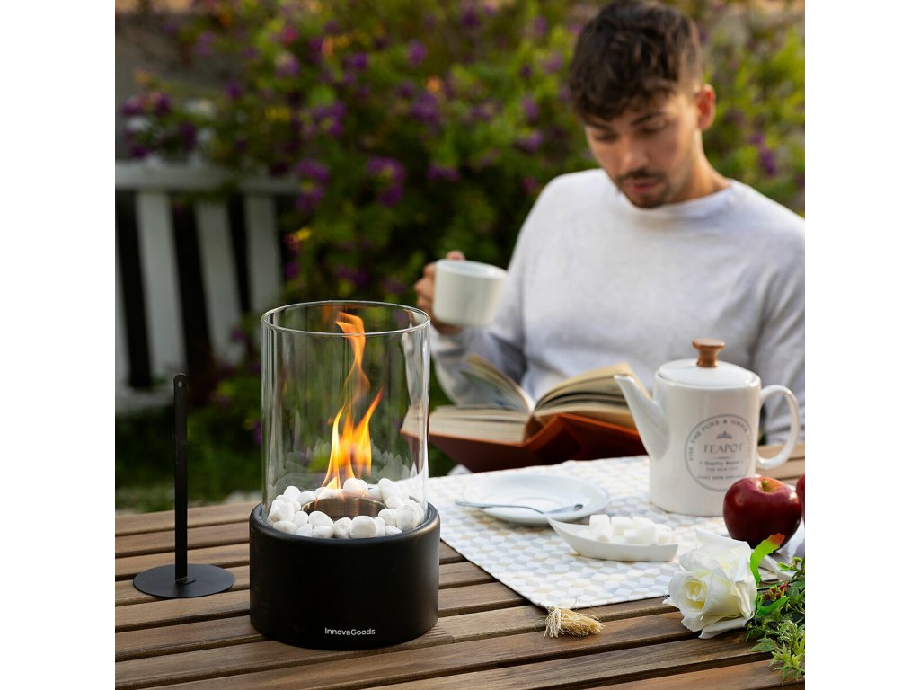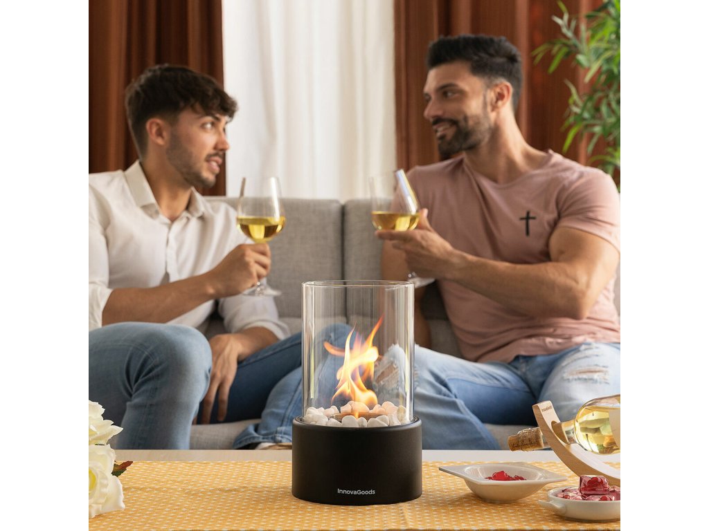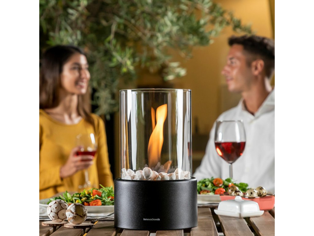 Stolný krb Heatfir od InnovaGoods je navrhnutý tak, aby poskytoval príjemné teplo a svetlo v rôznych prostrediach. Jeho elegantný čierny dizajn s kombináciou skla a kovu sa hodí do moderných aj tradičných interiérov. Krb je ľahko prenosný a vďaka kompaktným rozmerom Ø16 x 26,5 cm ho môžete umiestniť na stôl v obývačke, spálni alebo na terase.