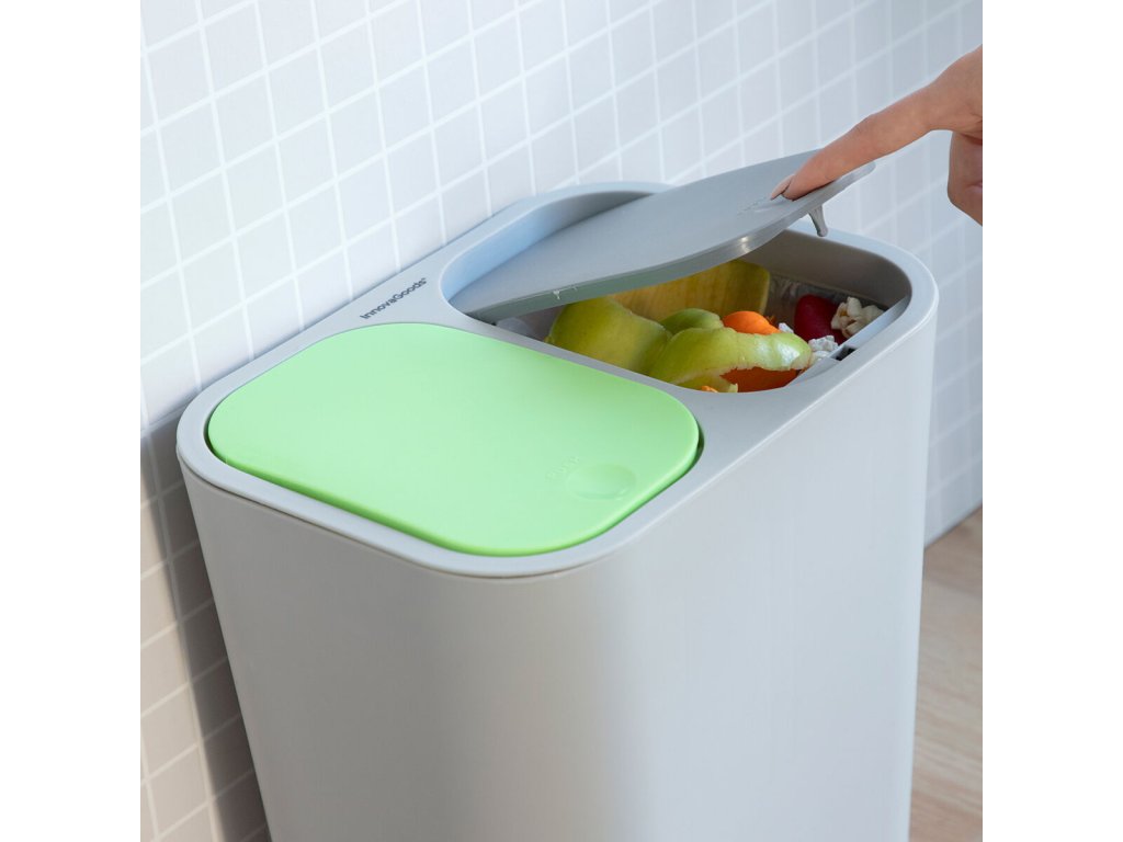 InnovaGoods vám ponúka najnovšie výrobky pre vašu domácnosť ako sú Dvojitý odpadkový kôš na triedený odpad Bincle InnovaGoods ! Objavte širokú škálu vysoko kvalitných výrobkov, ktoré vynikajú svojou funkčnosťou, efektivitou a inovačným dizajnom: osvetlenie, usporiadanie, dekorácia, klimatizácia, záhrada, domáce zvieratá, upratovanie atď.Dvojitý odpadkový kôš, ktorý umožňuje triediť odpad (bio, plasty atď.), uľahčuje jeho následnú recykláciu a prispieva k zodpovednej spotrebe a ochrane životného prostredia. 2 priečinky s objemom 7,5 l vďaka vyberateľnej priehradke ho možno použiť aj ako jednodielny kôš s celkovou kapacitou 15 l. Moderný dizajn so zaoblenými hranami a jemným dotykom umožňuje pohodlné umiestnenie do rôznych priestorov (kuchyňa, kúpeľňa, terasa, kancelária a i.). Veľmi univerzálny kôš na recyklovaný odpad, jednoduché uchytenie vrecka v ráme, pohodlné použitie vďaka 2 sklopným vekám s tlačidlom (pomalé automatické otváranie „push“). Ľahký, odolný a odnímateľný, jednoducho sa čistí.
