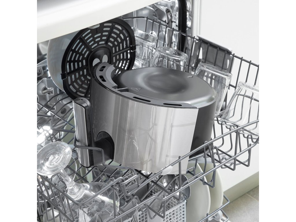 - Čistenie a údržba: Niektoré recepty vyžadujú použitie nádob vhodných na vyprážanie, najlepšie silikónových. Aby ste predišli poškodeniu nepriľnavej vrstvy koša, neodporúča sa používať kovové nádoby ani abrazívne čistiace prostriedky. Odnímateľný kôš je vhodný do umývačky riadu.