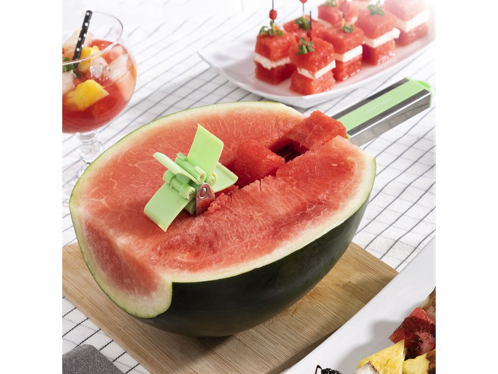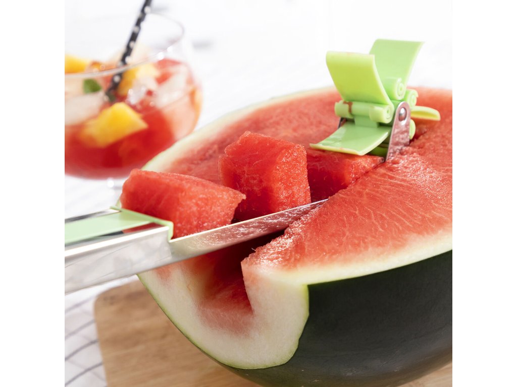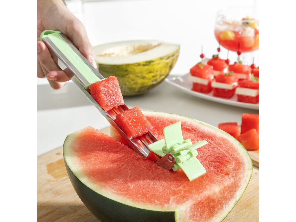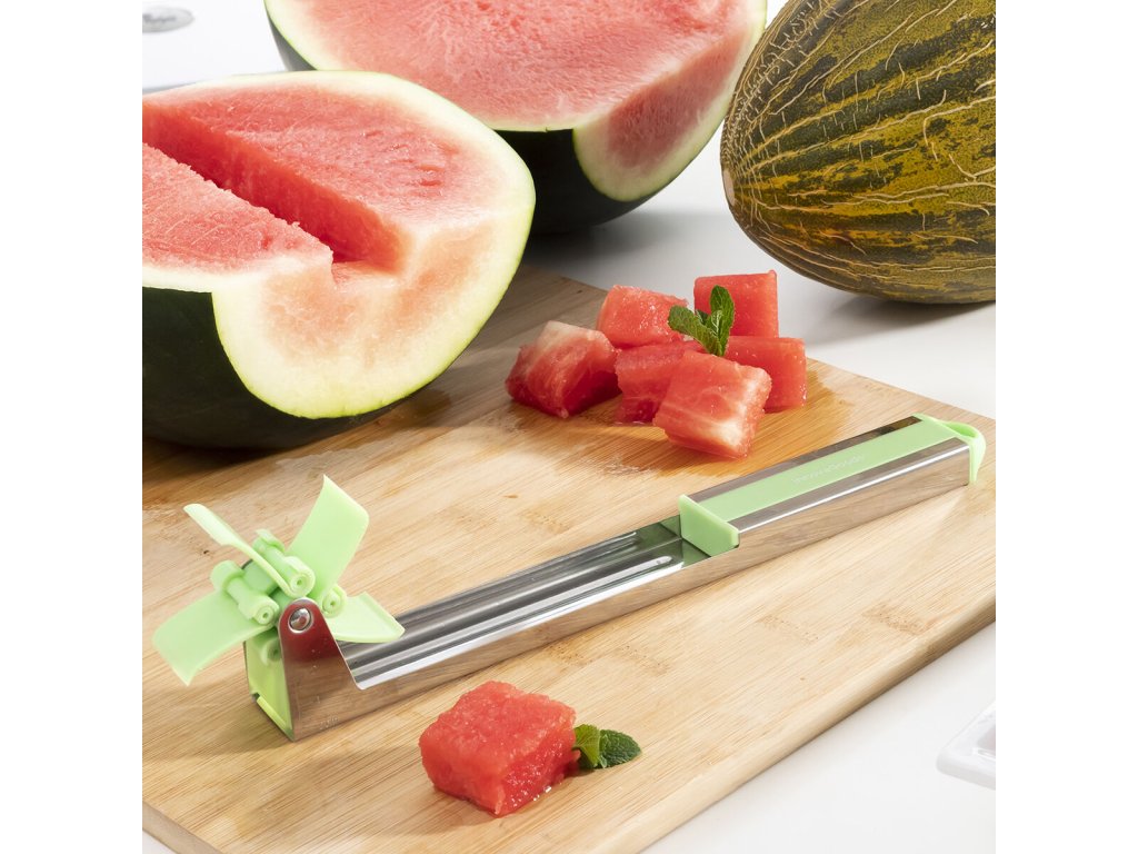 InnovaGoods je tu, aby vám pomohla variť ľahšie a zábavným spôsobom a preto vám ponúka novinky pre vašu kuchyňu, ako sú Krájač melónu na kocky Cutmil InnovaGoods ! Objavte širokú škálu vysoko kvalitných výrobkov, ktoré vynikajú svojou funkčnosťou, efektivitou a inovačným dizajnom!Originálny krájač melónu na kocky, ktorý musíte mať v najmodernejších a najpraktickejších kuchyniach, pretože vám ušetrí čas a námahu a rýchlo a jednoducho dosiahne dokonalý výsledok. Má čepele a robí rovnomerné a presné rezy v geometrickom a rovnakom tvare kocky. Jeho predĺžená rukoväť poskytuje pevné uchopenie. Na systematické získavanie kociek stačí tlačiť a posúvať krájač po povrchu otvoreného melónu. Oveľa bezpečnejší rezaný systém ako bežný nôž, ktorý zabraňuje možnému poškodeniu pri používaní. Tento ručný kuchynský riad je skvelým pomocníkom pri príprave prírodných dezertov s najlepšou prezentáciou, vďaka čomu je konzumácia ovocia príťažlivejšia pre dospelých aj deti. Ideálny na vychutnanie si vynikajúcich kociek melónu samotných alebo spolu s iným ovocím v kreatívnych špízoch. Okrem toho je krájač kompaktný, robustný a ľahký, takže ho možno ľahko skladovať. Hoci sa používa najmä na krájanie dyne, dá sa použiť aj na krájanie melónu. Nie je vhodný do umývačky riadu, preto ho odporúčame umývať ručne. Obsahuje návod na použitie s obrázkami.