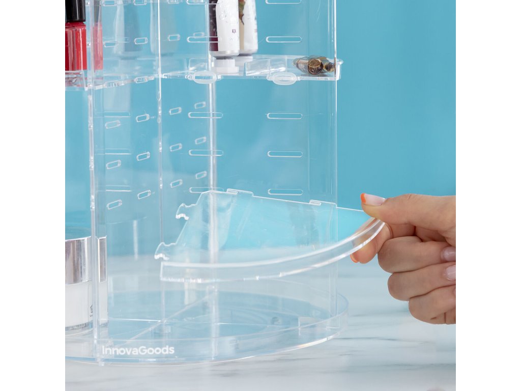 Otočný kozmetický organizér Rolkup InnovaGoods je ideálnym riešením pre tých, ktorí chcú mať svoje kozmetické produkty vždy po ruke a systematicky usporiadané. Jeho inovatívny kruhový dizajn z transparentného polystyrénu umožňuje ľahkú vizualizáciu obsahu, čo zjednodušuje výber potrebných produktov.