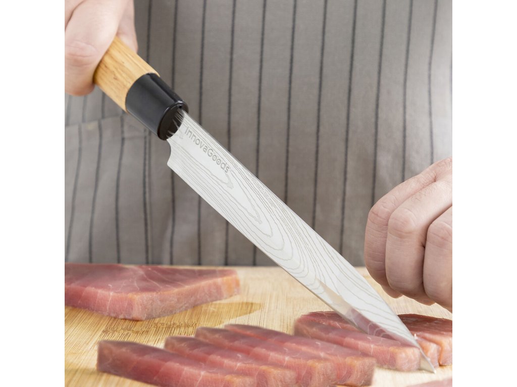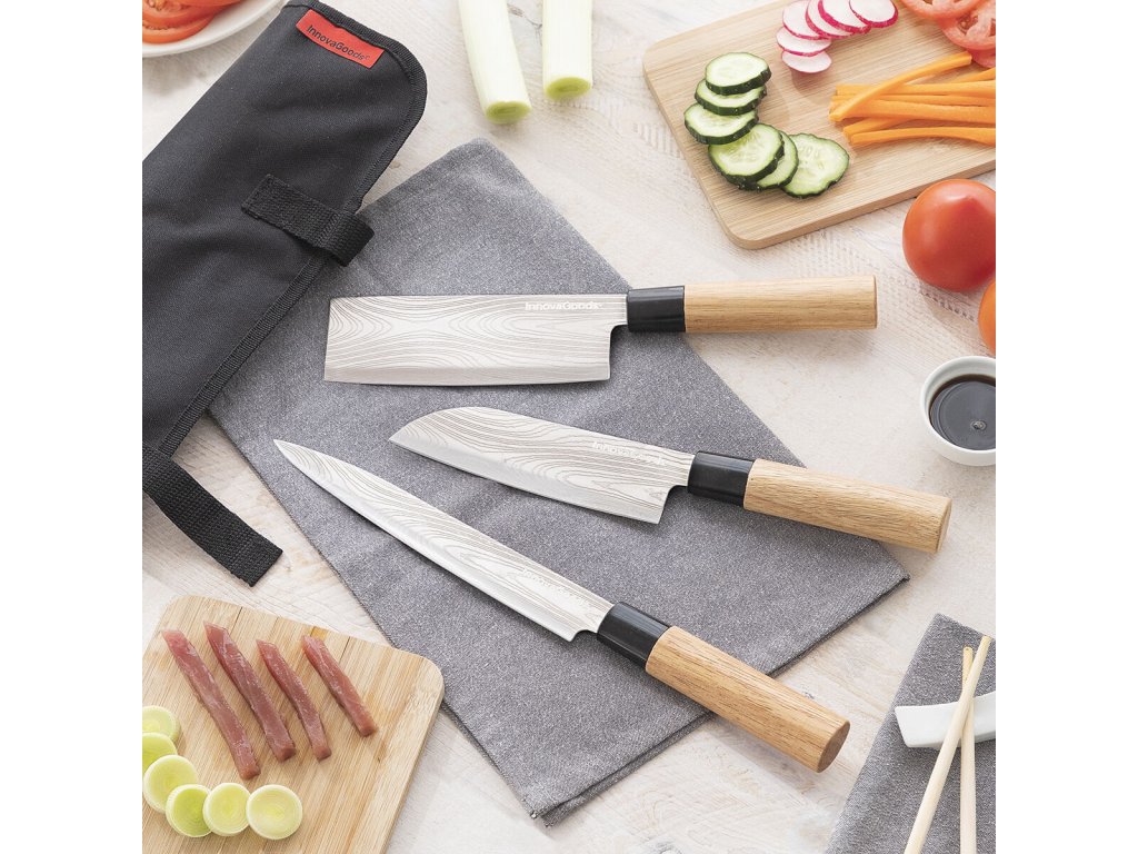 Sada nožov Damas·Q od značky InnovaGoods je navrhnutá pre profesionálnych kuchárov aj nadšencov varenia, ktorí ocenia kvalitu a štýl. Sada obsahuje tri nože s čepeľami z nerezovej ocele s hrúbkou 2,5 mm, zdobené laserovou potlačou v štýle Damasku, čo im dodáva exkluzívny a elegantný vzhľad. Drevené rúčky poskytujú pohodlný a bezpečný úchop počas používania.