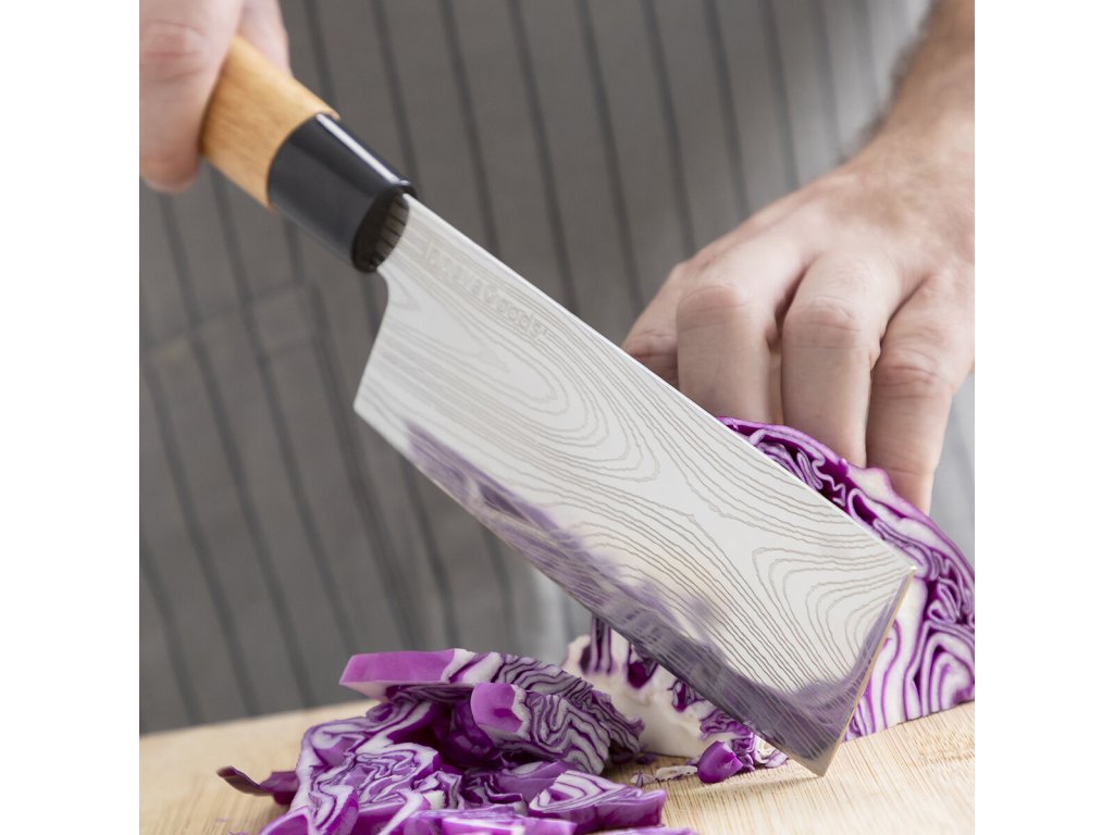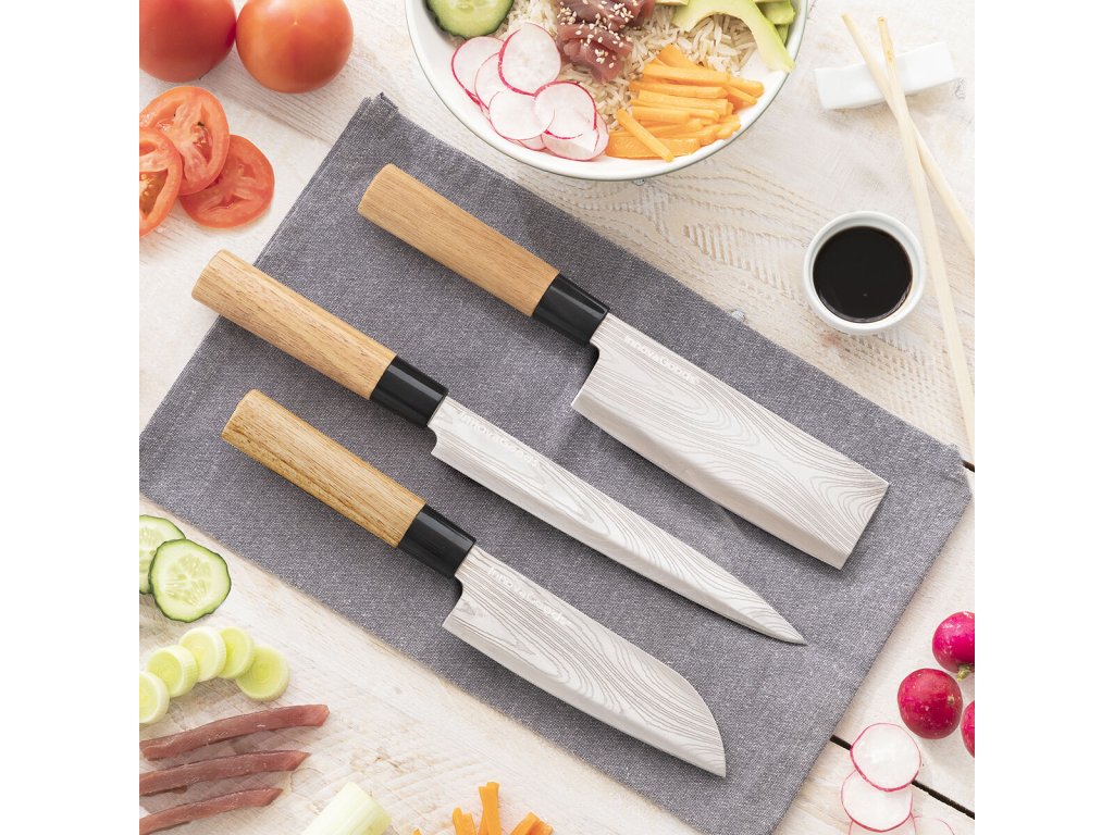 - Santoku nôž: Univerzálny nôž vhodný na krájanie zeleniny, mäsa či rýb.