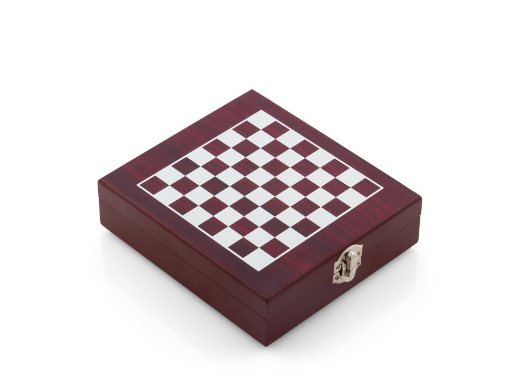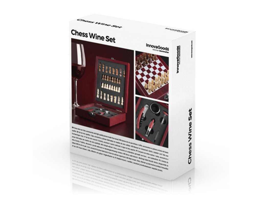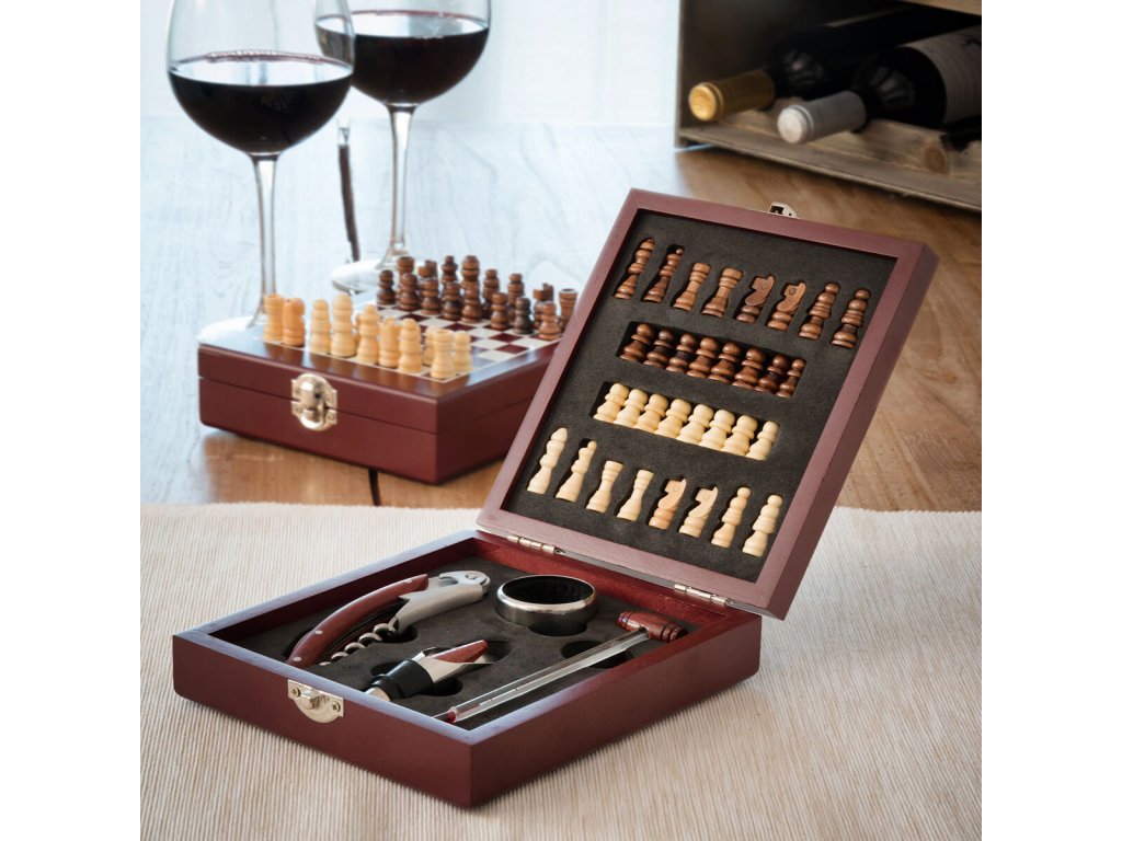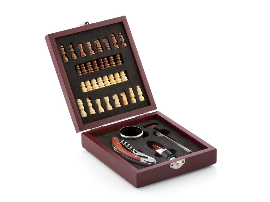 Set obsahuje vývrtku, zátku na fľašu, lievik s filtrom, teplomer na víno a ďalšie praktické doplnky. Šachovnica je súčasťou kazety, vďaka čomu je táto súprava nielen štýlová, ale aj praktická. Ideálny darček pre milovníkov šachu a vína!
