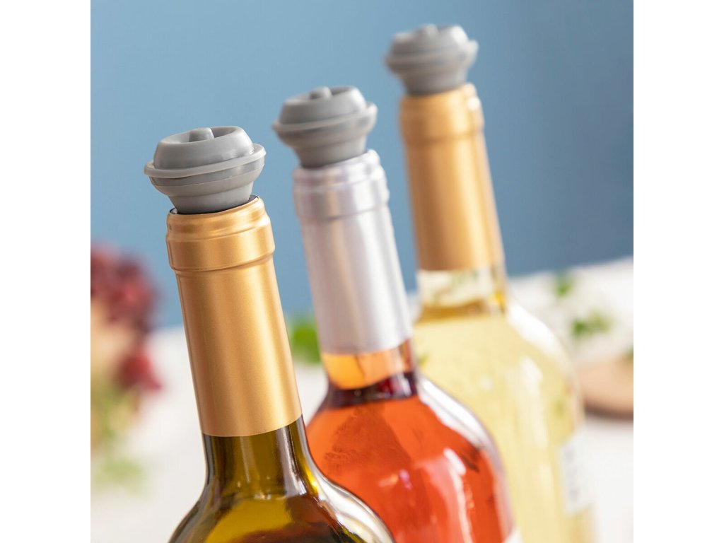 - 4 vákuové zátky: naša vákuová pumpa na fľaše vína obsahuje 4 umývateľné a opakovane použiteľné zátky. Môžete mať otvorených niekoľko fliaš vína a každý deň si vybrať víno, ktoré uprednostňujete, bez toho, aby ste sa museli starať o dopíjanie fľaše. Každá zátka má malý ventil, ktorý stlačíte na niekoľko sekúnd, aby ste odstránili vzduch z fľaše.