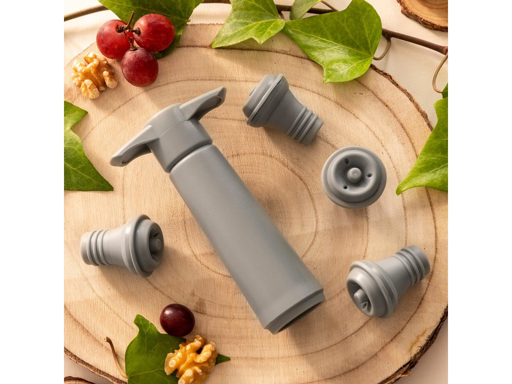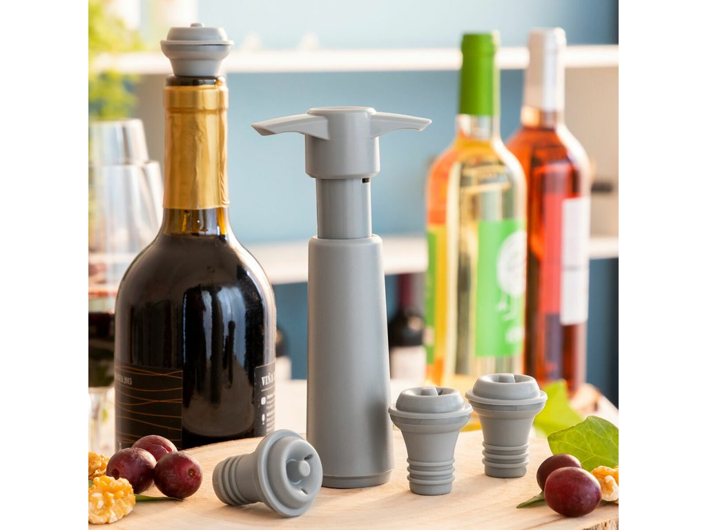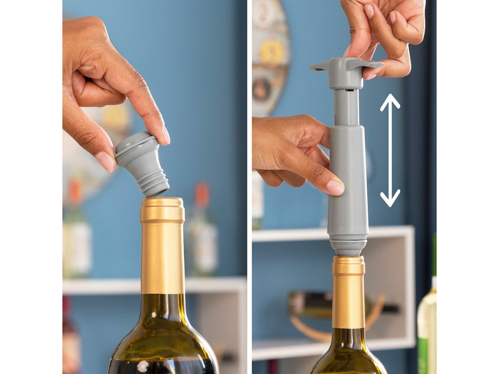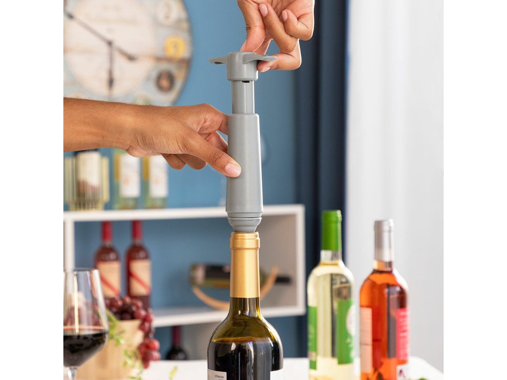 - Ručná vákuová pumpa: táto vákuová pumpa na použitie s otvorenými fľašami vína pomáha dlhšie uchovávať víno v optimálnom stave, pretože odsáva vzduch z fľaše bez toho, aby víno stratilo svoje vlastnosti.