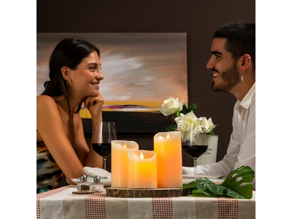 - LED sviečky, efekt skutočného plameňa: naša sada 3 LED sviečok vás zaujme svojou originalitou a všestrannosťou. Jej blikajúci, kolísajúci sa LED plameň napodobňuje skutočný plameň ohňa s úžasnou realitou. Nefúkajú vo vetre a zabraňujú popáleninám a požiarom. Každá sviečka funguje s 2 AA batériami (nie sú súčasťou balenia).